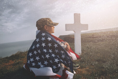 Child,Teenager,Wrapped,In,An,American,Flag,Sits,On,The